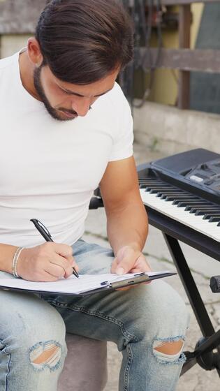 Man Is Composing A Music Writing On The Sheet Music And Rehearsing On Keyboard Pro Video