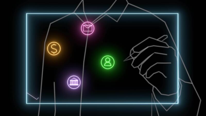 A figure points at a glowing interface displaying user-related, banking, communication, and finance icons, against a black background Pro Video