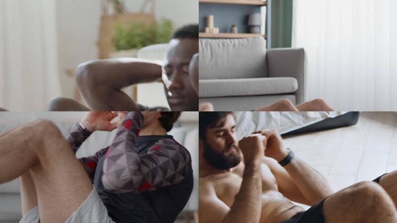 A set of individuals from various backgrounds perform core workout exercises at home in bright, inviting spaces. They focus on maintaining fitness through dynamic routines. Pro Video