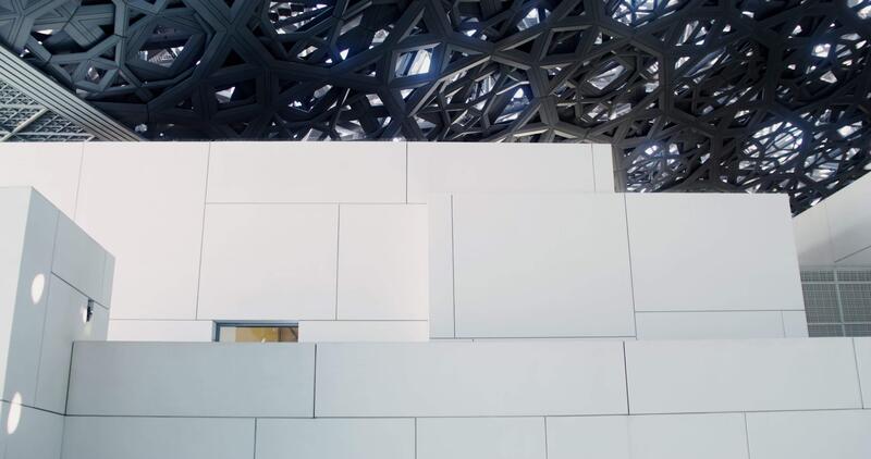The white facade of an abstract building with an openwork canopy. Minimalistic modern architecture