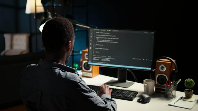 African american expert at desk using pc for programming and data analysis. Young networking expert working from his home setup, manages information technology and data center. Camera A. Pro Video