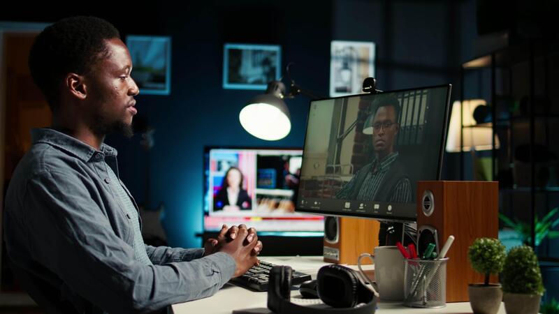 African American man enjoys conferencing with manager at desk, discussing with his colleague online using a computer at home office setup. Young associates team meeting online. Camera A. Pro Video