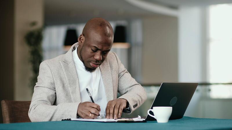 Smiling African professional businessman making call on cellphone using laptop computer communicating with client. Happy young business man sales manager talking on mobile phone working in office Pro Video