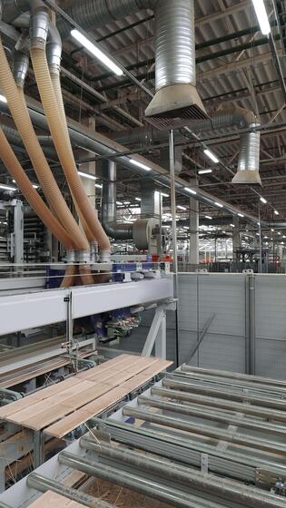 modern process of working of floorboard on an automated line. A waste avoidance. Vertical Pro Video