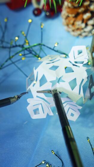 Gadget humanoid preparing snowflake from paper while preparing to the Christmas. Cropped view. Future technologies concept. Vertical Pro Video