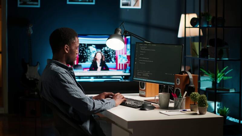 African american expert at desk using pc for programming and data analysis. Young networking expert working from his home setup, manages information technology and data center. Camera B. Pro Video