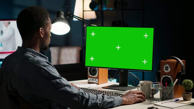 Trading engineer looks at e commerce diagrams and isolated copy space display, working from home to increase profit and obtain funding from shareholders. Expert evaluates statistics. Camera B. Pro Video