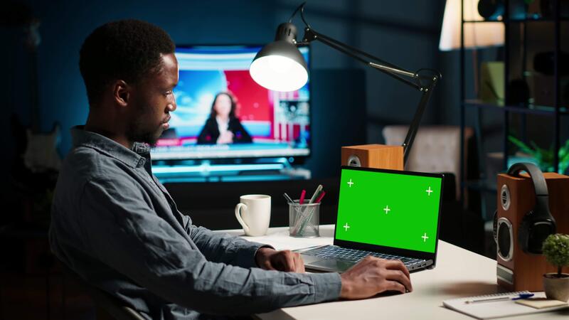 Black man creating a report with data next to isolated chroma key display, improving his skills and achieving career independence. Remote worker solving daily freelance tasks. Camera B. Pro Video