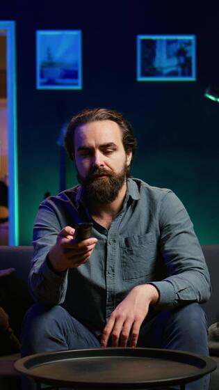 Vertical Bored person on couch in front of TV binging series on subscription based streaming services, browsing using remote. Weary man watching VOD shows on television set, zapping though channels, camera B Pro Video