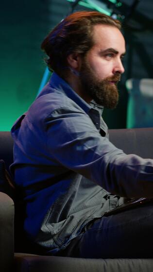 Vertical Man working on laptop lounged on neon lit apartment couch while picking TV channel to watch as distraction. Remote worker solving company tasks on notebook with TV show playing in background, camera A Pro Video