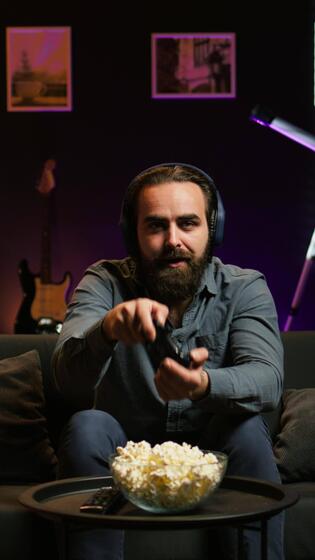Vertical Gamer feeling overjoyed after winning videogame level, screaming in excitement. Ecstatic man at home yelling from joy after achieving victory while playing on gaming console, camera B Pro Video