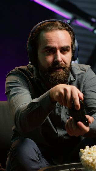 Vertical Man looking in disbelief at TV screen while playing videogames, receiving game over message on gaming console. Gamer upset after being defeated by rival players in online esports competition, camera A Pro Video