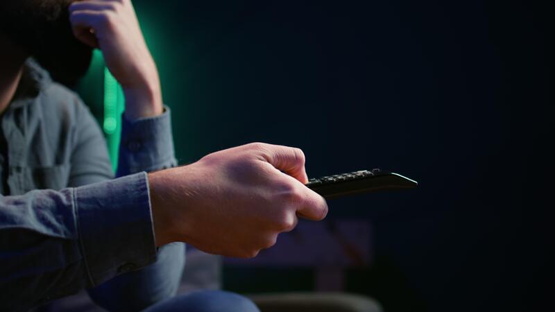 Close up of man on couch using remote control to browse though movies available on streaming service. Focus on remote control used by homeowner in apartment switching channels on TV, camera B Pro Video