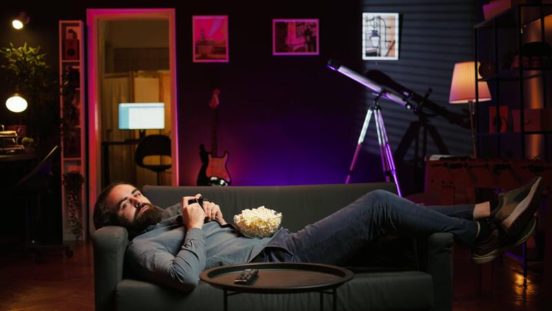 Gamer lounged on couch engaging in multiplayer game using gamepad, eating snack. Person in home theatre playing videogames on gaming console with bowl of popcorn in lap, camera B Pro Video