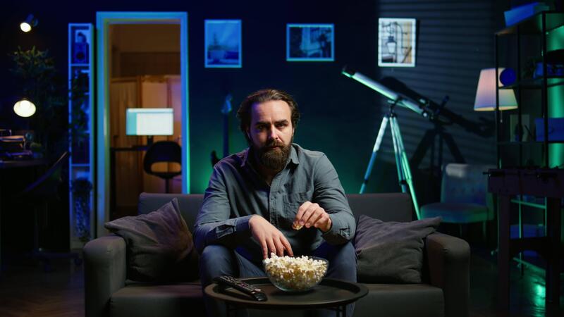 Puzzled man eating popcorn while watching confusing movie on streaming service, enjoying time off from work. Person consuming snacks, looking at film broadcasted on TV with convoluted plot, camera B Pro Video