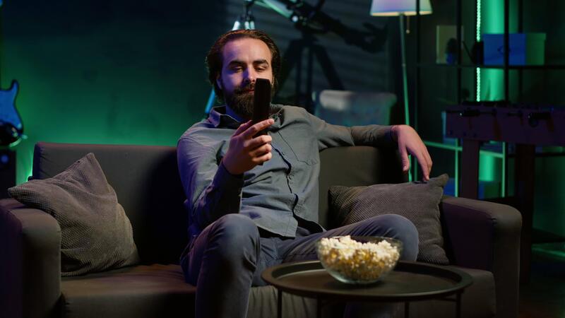 Man using remote to switch channels on television screen, feeling frustrated by uninteresting content. Bored person scrolling through TV channels, upset after not finding anything watchable, camera A Pro Video
