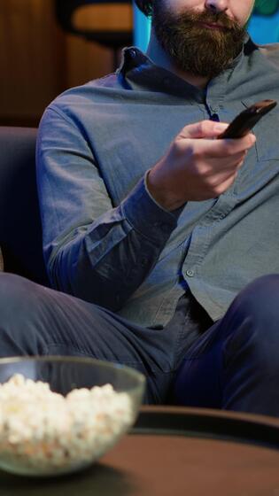 Vertical Man sitting on couch browsing though movies available on streaming service, enjoying time off from work. Person in apartment using remote control to switch channel on television set, camera A Pro Video