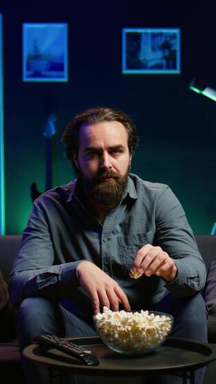 Vertical Puzzled man eating popcorn while watching confusing movie on streaming service, enjoying time off from work. Person consuming snacks, looking at film broadcasted on TV with convoluted plot, camera B Pro Video