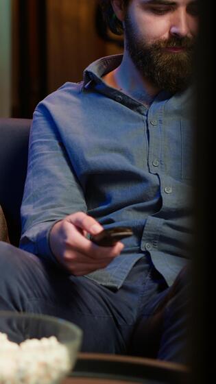 Vertical Smiling person on couch picking movie on streaming service using remote and texting on mobile phone. Happy man watching shows on television, zapping though channels, chatting smartphone, camera A Pro Video