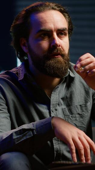 Vertical Puzzled man eating popcorn while watching confusing movie on streaming service, enjoying time off from work. Person consuming snacks, looking at film broadcasted on TV with convoluted plot, camera A Pro Video