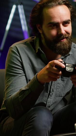 Vertical Excited man holding controller in neon illuminated apartment, playing videogames. Happy gamer on couch using joystick to participate in PvP game on console system, relaxing and having fun, camera A Pro Video