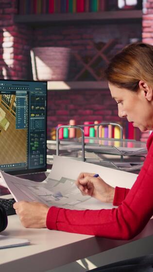 Vertical Remote worker in creative office uses CAD software and blueprints plan, design a house interior and provides a user interface for virtual home customization. Detailed architectural layout. Camera B. Pro Video