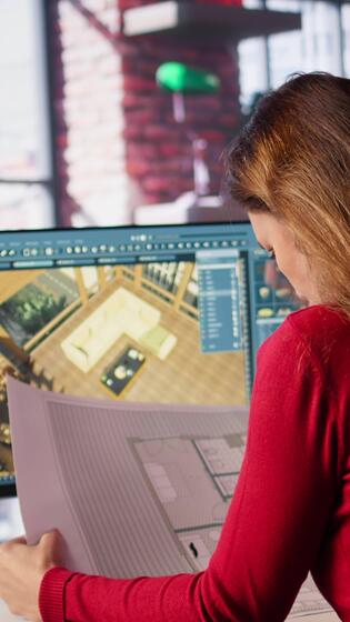 Vertical Graphic artist uses architectural software and blueprints to create 3D render of a home interior. Program allows to configure furniture and other design elements for a virtual layout. Camera B. Pro Video
