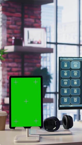 Vertical Independent person using computer with green screen for remote job tasks at home setup, surrounded by notes and enjoying the benefits of schedule flexibility. Modern lifestyle. Camera B. Pro Video