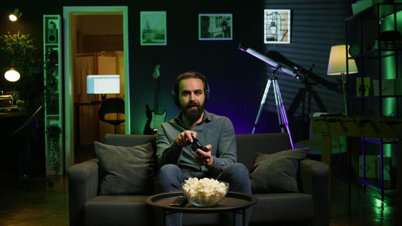 Satisfied gamer bragging after finally defeating all enemies while playing on gaming console. Pleased player congratulating himself after winning videogame using controller, camera B Pro Video