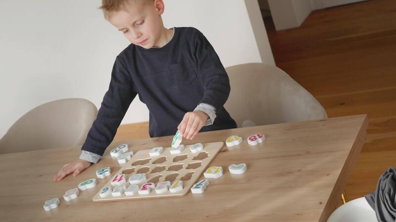 the boy learns to count, holds a board with numbers-puzzles arranged in order from 1 to 20, the boy is 4-5 years old European appearance, at home sits at the table, preparation for school Pro Video
