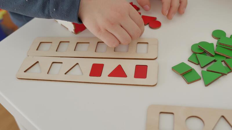 The child carefully arranges red wooden geometric shapes circle, square, triangle and rectangle on the table, sorting them by shape. A wonderful Montessori-inspired learning experience. Pro Video