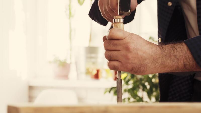Craftsman using chisel and hammer to shape wood in bright workshop with plants Pro Video