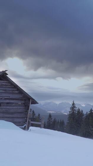 A rustic cabin sits in a snowy landscape with towering mountains in the background. Dark clouds loom overhead, hinting at a change in weather during winter. Vertical footage Pro Video