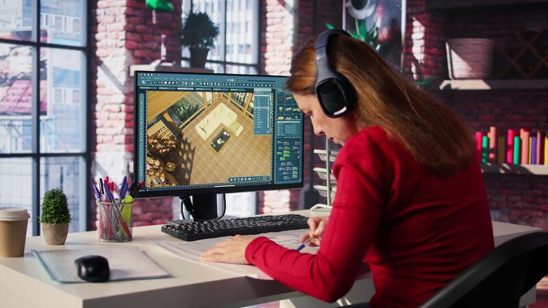 Female employee creates 3D render of an apartment interior using blueprints and architectural software. Employs computer aided tools and models to allow customization of flooring. Camera B. Pro Video