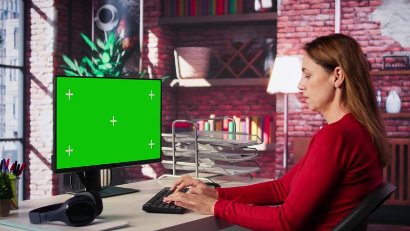 Adult woman typing on pc with chroma key screen at her loft desk, engaging in online work, multitasking efficiently and embracing the flexibility of remote tasks in a home setting. Camera B. Pro Video