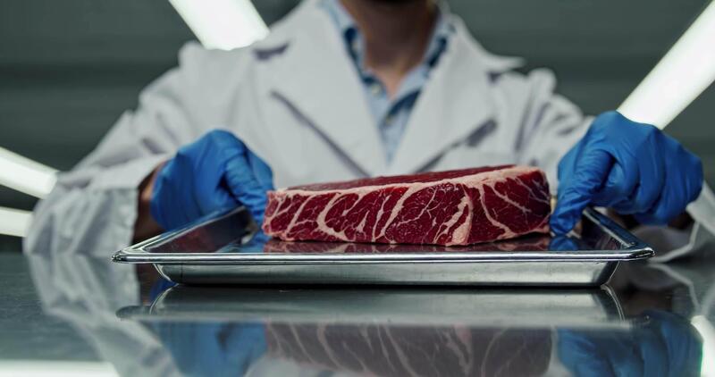 a piece of fresh meat in the hands of a scientist in a laboratory. creation and study of artificial meat in a laboratory Free Video