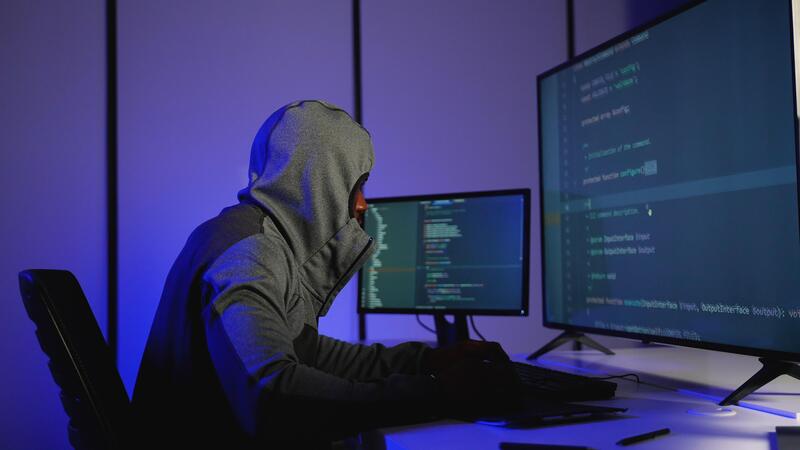Anonymous hacker in hoodie coding cyber attack in dark room Pro Video