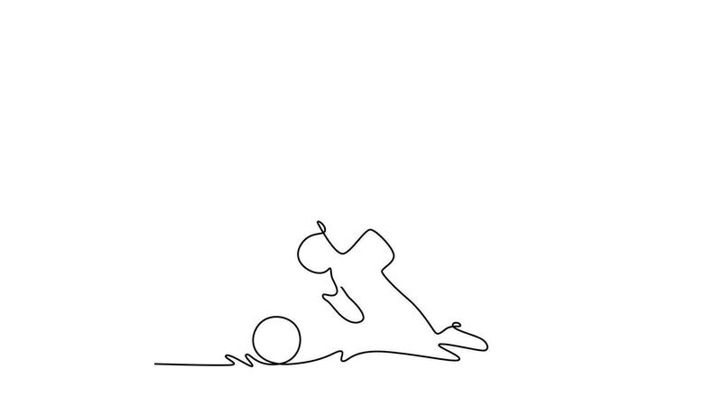 Animated self drawing of continuous line draw male football player defender make move to block and control the ball to avoiding opponents. Soccer match sport concept. Full length single line animation Pro Video