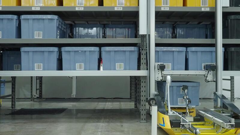 Demo of Automated Retail Warehouse AGV Robots Delivering distribution product stock on shelf in modern factory. Smart warehouse Logistics management system with warehouse robot. AI Technology Pro Video