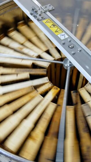 Centrifuge device pumping honey from cells. Honey extractor is spinning with frames with honeycombs. Process of getting honey from honeycomb. Vertical Pro Video