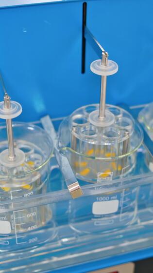 Experiments at the lab. Sliding shot of a dissolution apparatus testing medication pills dissolving tablets in liquid. Laboratory routine. Vertical Pro Video