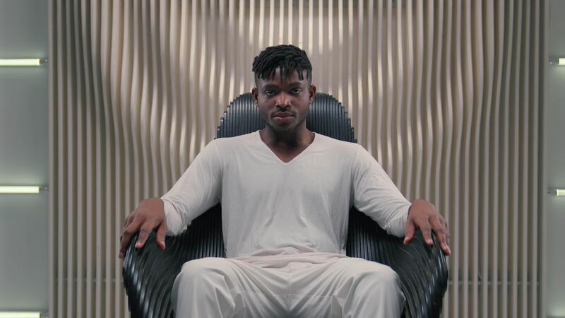 Futuristic confident serious gamer programmer hacker African American man guy male sitting in chair in futurism modern room studio in chair looking at camera 3D computer graphics AI network concept Pro Video