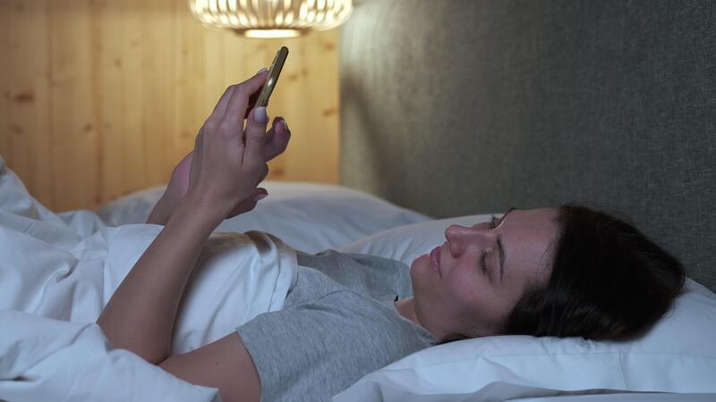 Relaxed woman lying comfortably in bed during nighttime, engaging with smartphone while scrolling and tapping through digital content with soft illumination from screen Pro Video