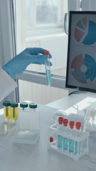 In a modern lab, a dedicated scientist in a lab coat and gloves holds a test tube, analyzing data on a nearby computer. Numerous test tubes with various samples are around for further experiments Pro Video