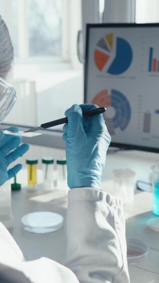 A scientist in a lab coat and gloves conducts vital vaccine research, carefully examining a test tube and analyzing complex data on a monitor, highlighting the importance of their work for healthcare Pro Video