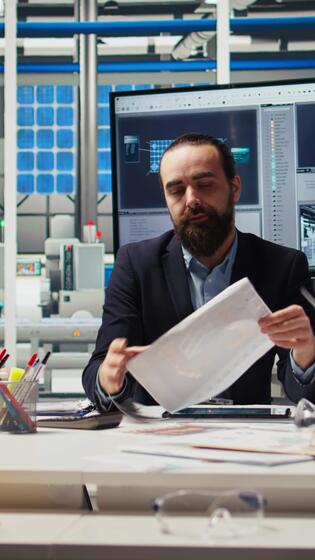 Vertical Business executives meet with investors to discuss the integration of automation technology in solar panel production processes, looking over paperwork and schematics, camera A Pro Video