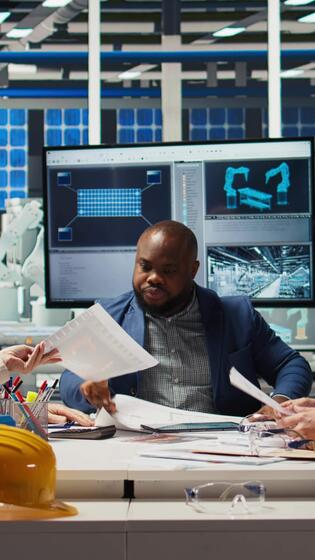 Vertical Factory manager presents business models to investors, highlighting innovative strategies for expanding production. Shareholders discuss integrating automation technology in industrial plant, camera A Pro Video