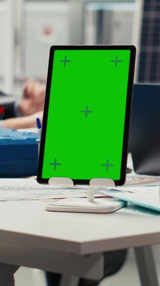Vertical Industrial plant researchers work on breakthroughs in durability and performance using isolated screen tablet, close up. Factory scientists use chroma key device to test materials for solar panels Pro Video