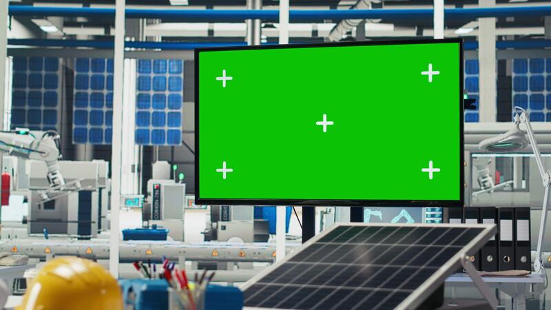 Isolated screen display overseeing solar panels plant, troubleshooting technical issues. Mockup monitor in photovoltaics factory used for analyzing data and reviewing system metrics Pro Video