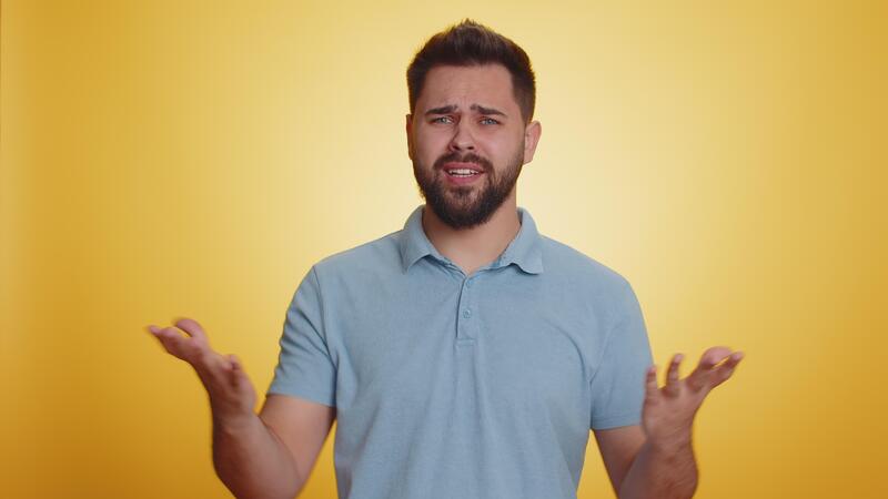 Man raising hands in indignant expression ask why what reason of failure demonstrating disbelief Pro Video